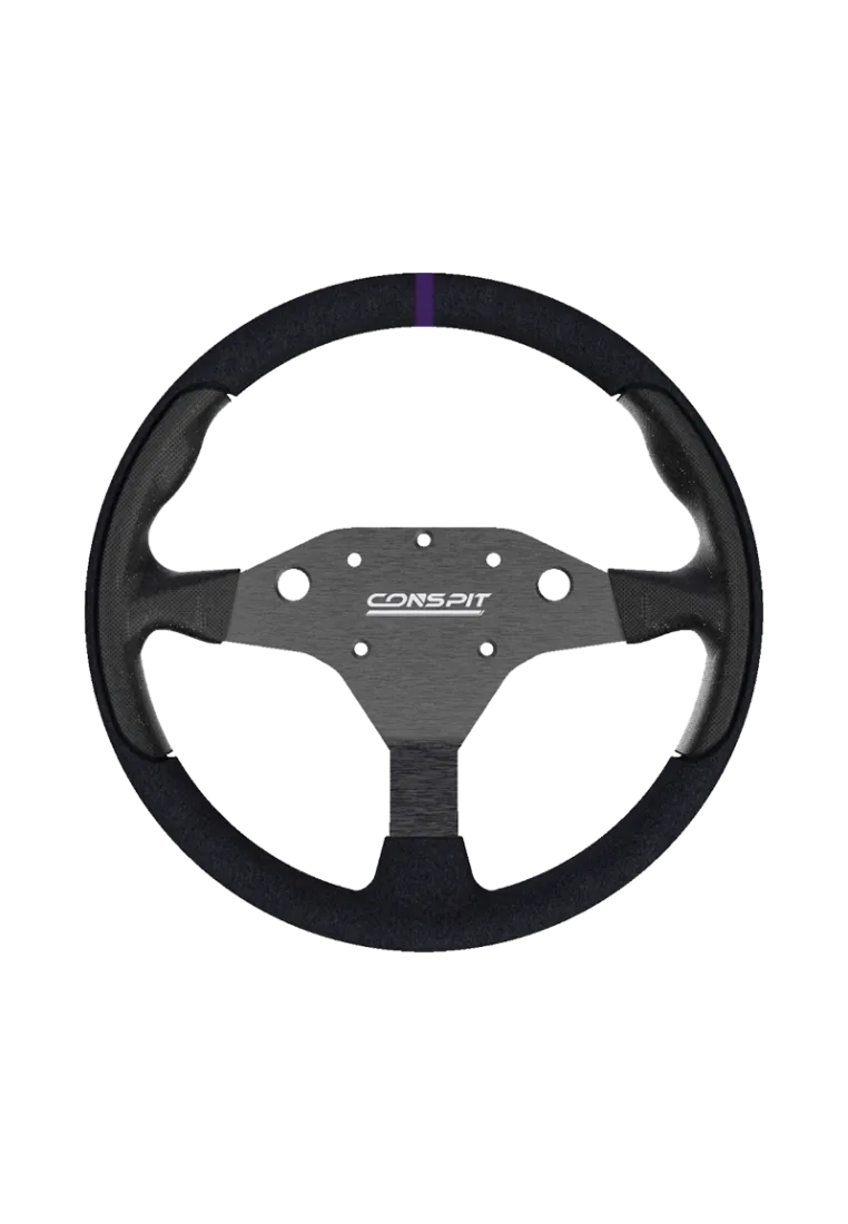 The Conspit RX320 is a 320 mm round sim racing wheel rim wrapped in perforated eco‑leather with purple stitching and a matching top marker. Fully compatible with the Conspit H.AO HUB for quick bolt-on installation—rim only, no electronics included