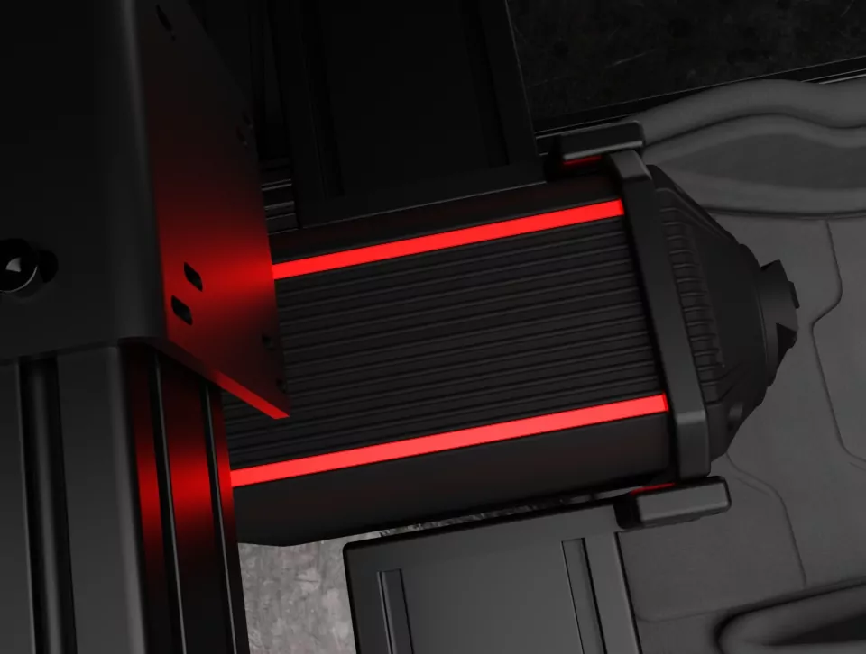 This mount offers an extensive range of tilt adjustment, allowing you to perfectly align the steering axis with your arms. The front-mount design also clears up space beneath the wheelbase, maximizing legroom—a crucial factor for comfort and ergonomics in Formula or GT-style low seating positions. The entire unit is finished in a deep matte black that perfectly complements the Asetek wheelbase design and Sabelt’s black profile rigs.