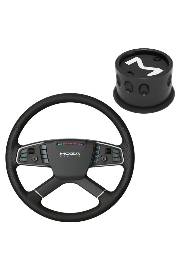 Discover the MOZA TSW Truck Wheel for unparalleled truck simulation, featuring a classic four-spoke, 400mm design. It combines comfort with hand-stitched microfiber leather and durability with an aerospace-grade aluminum frame. Customizable with RGB buttons and LED lights, it's compatible with all MOZA bases and third-party systems via a universal adapter. Ideal for simulation enthusiasts seeking an immersive experience.