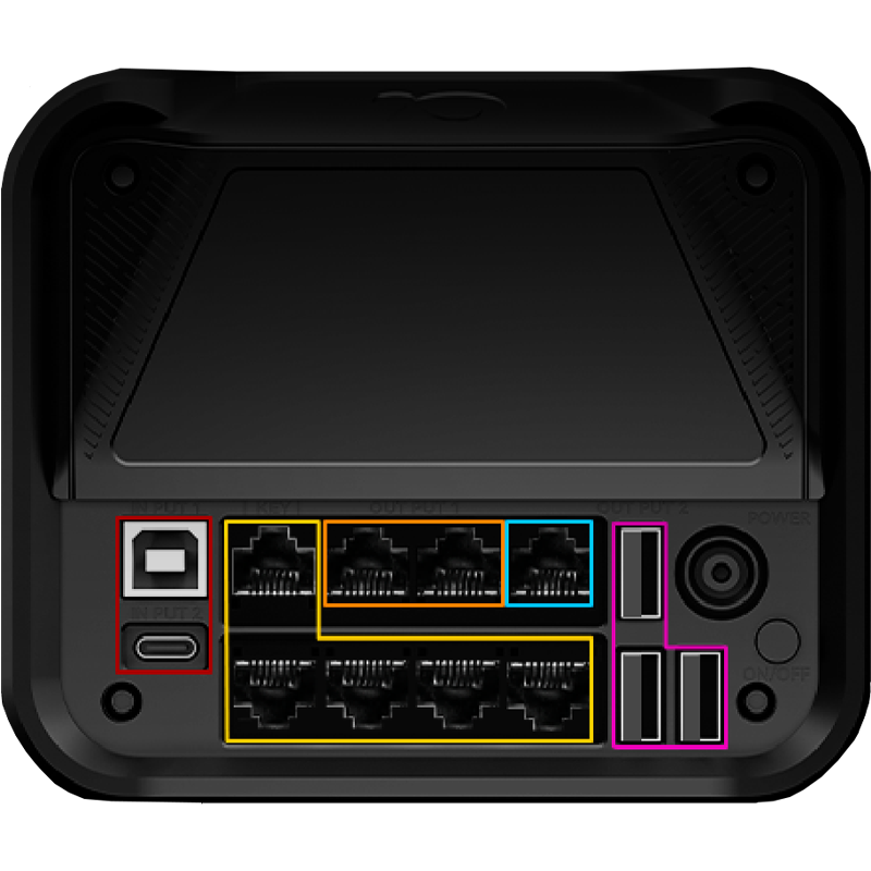 USB-A: Universal ports for a wide range of CAN accessories (including DS-8X, Q1, Q1-S shifters, TB-1 brake, and the entire P1000 and P2000 pedal families).
