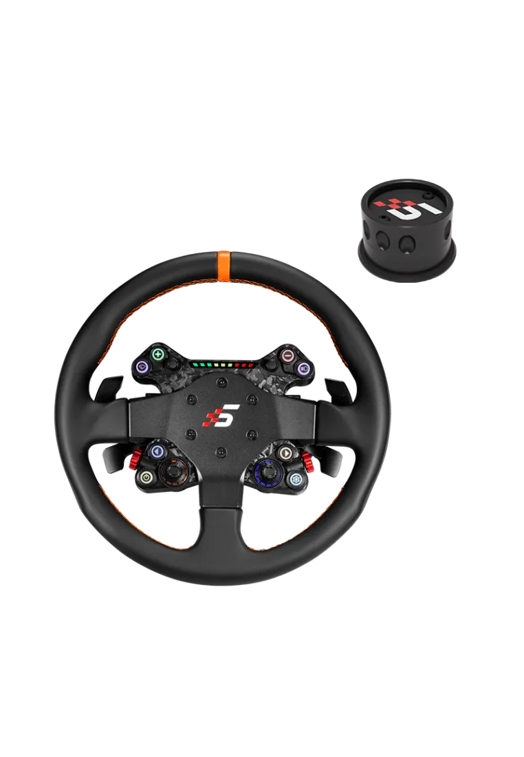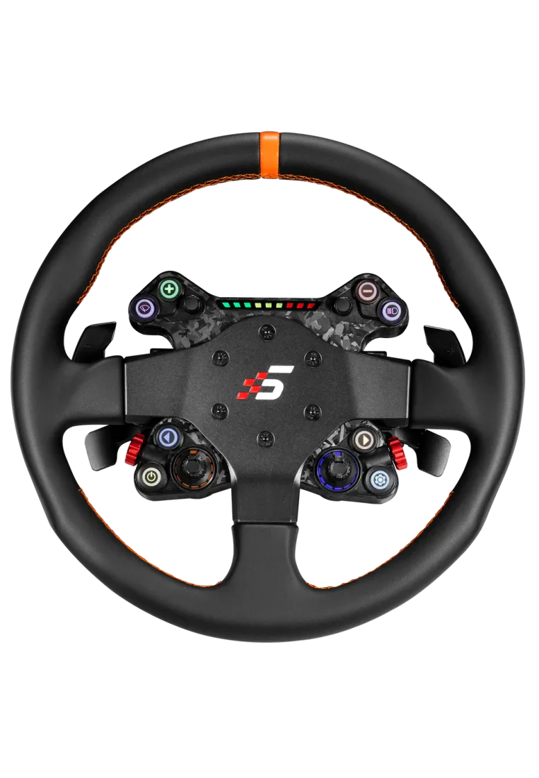 Neo X-330T – 330 mm GT racing wheel with CNC aluminum frame and black synthetic leather. Stiff build, orange stitching and dual paddle shifters for precision in sim racing.