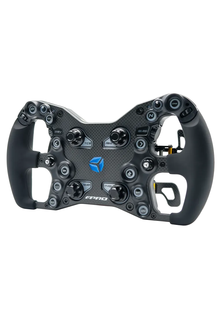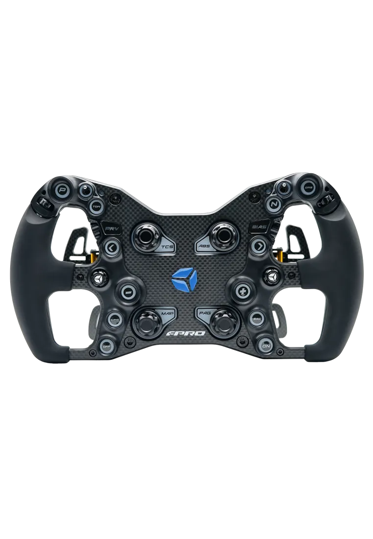 Cube Controls F‑PRO Color Edition to profesjonalna kierownica GT z karbonową płytą frontową, regulowanymi łopatkami biegów (contactless) i podwójnym sprzęgłem. Ergonomiczne rozmieszczenie przycisków i enkoderów pozwala szybciej zarządzać TCS, ABS, mapami i balansem hamulców.