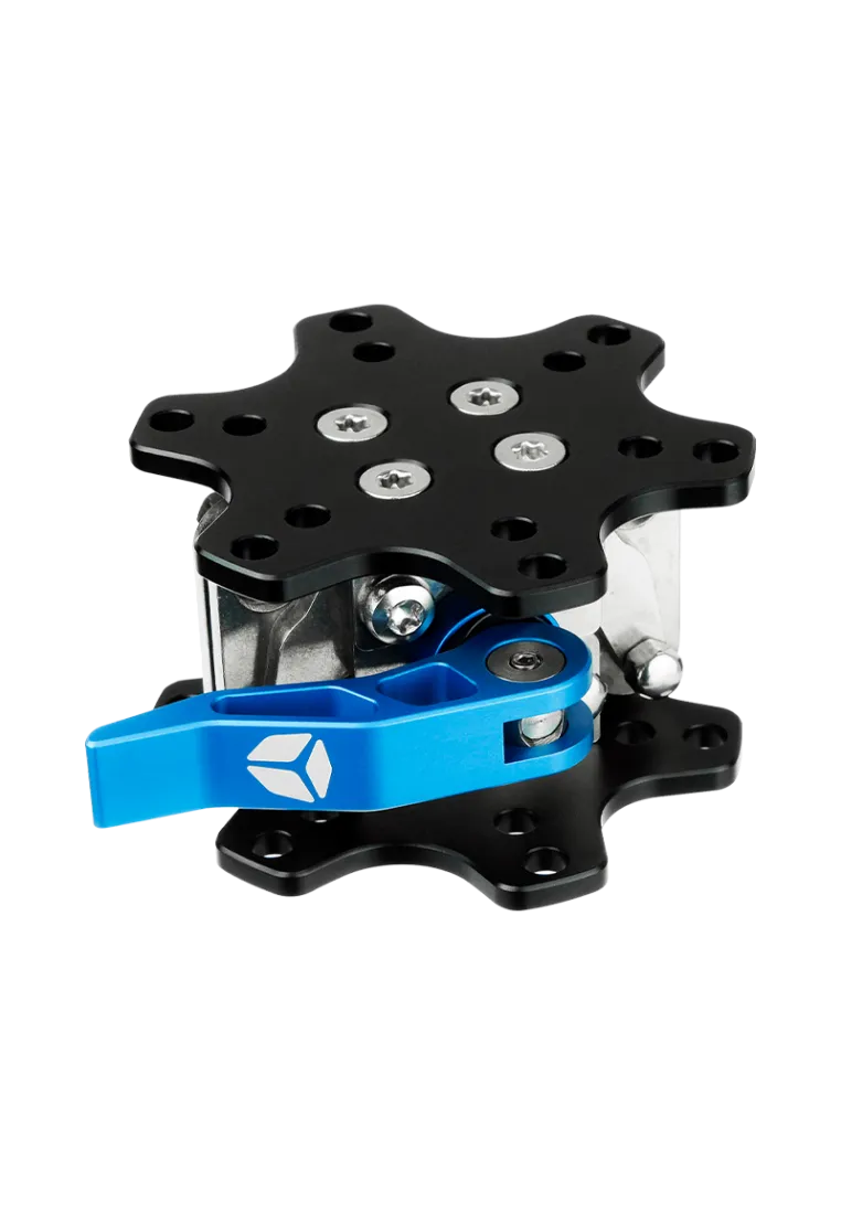 Podstawa z frezowanego aluminium, korpus ze stali ciętej laserowo – lekkość tam, gdzie trzeba, i sztywność tam, gdzie musi być. Ten QR znosi piki momentu z baz Direct Drive, trzyma koło bez najmniejszej gry i po prostu działa.