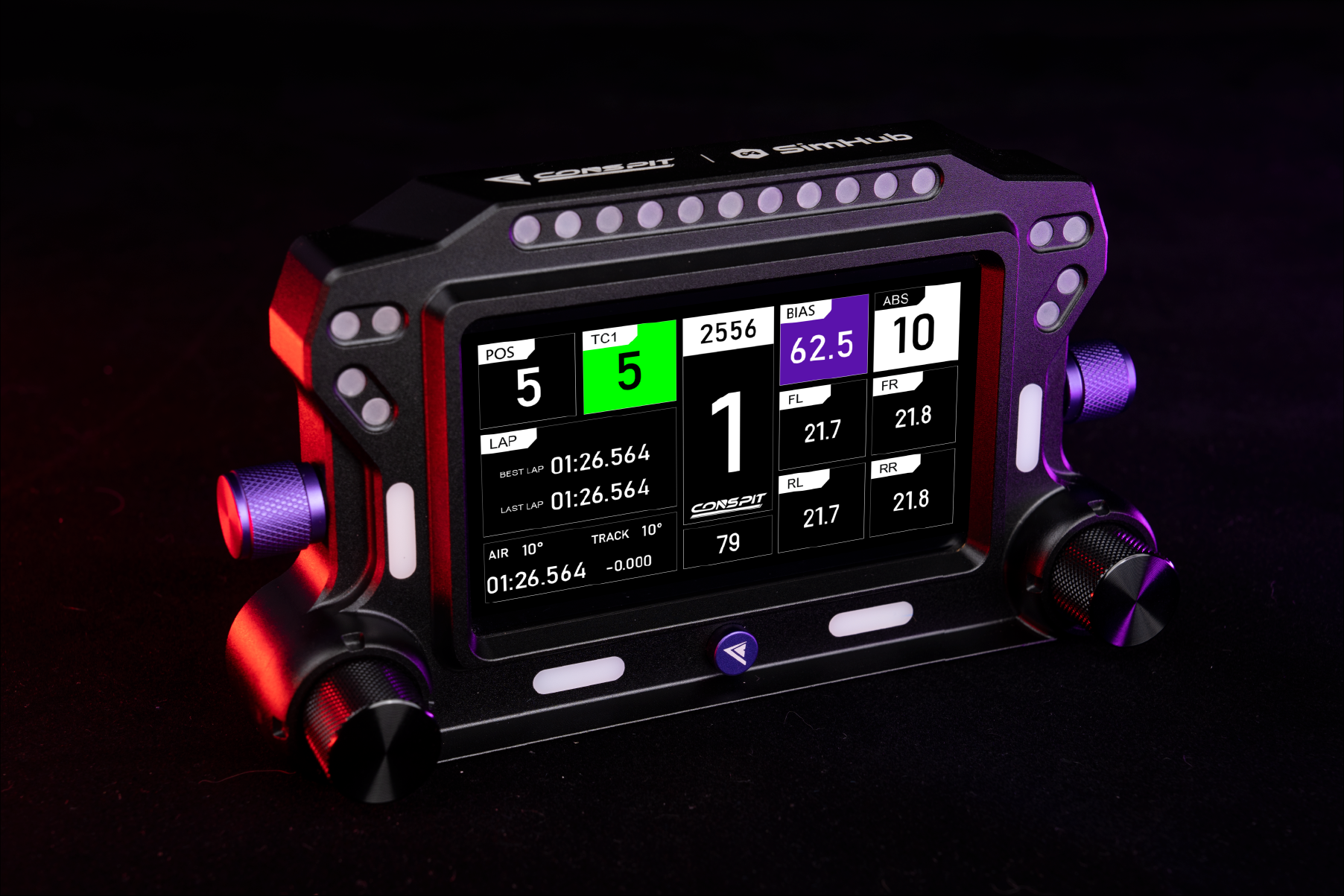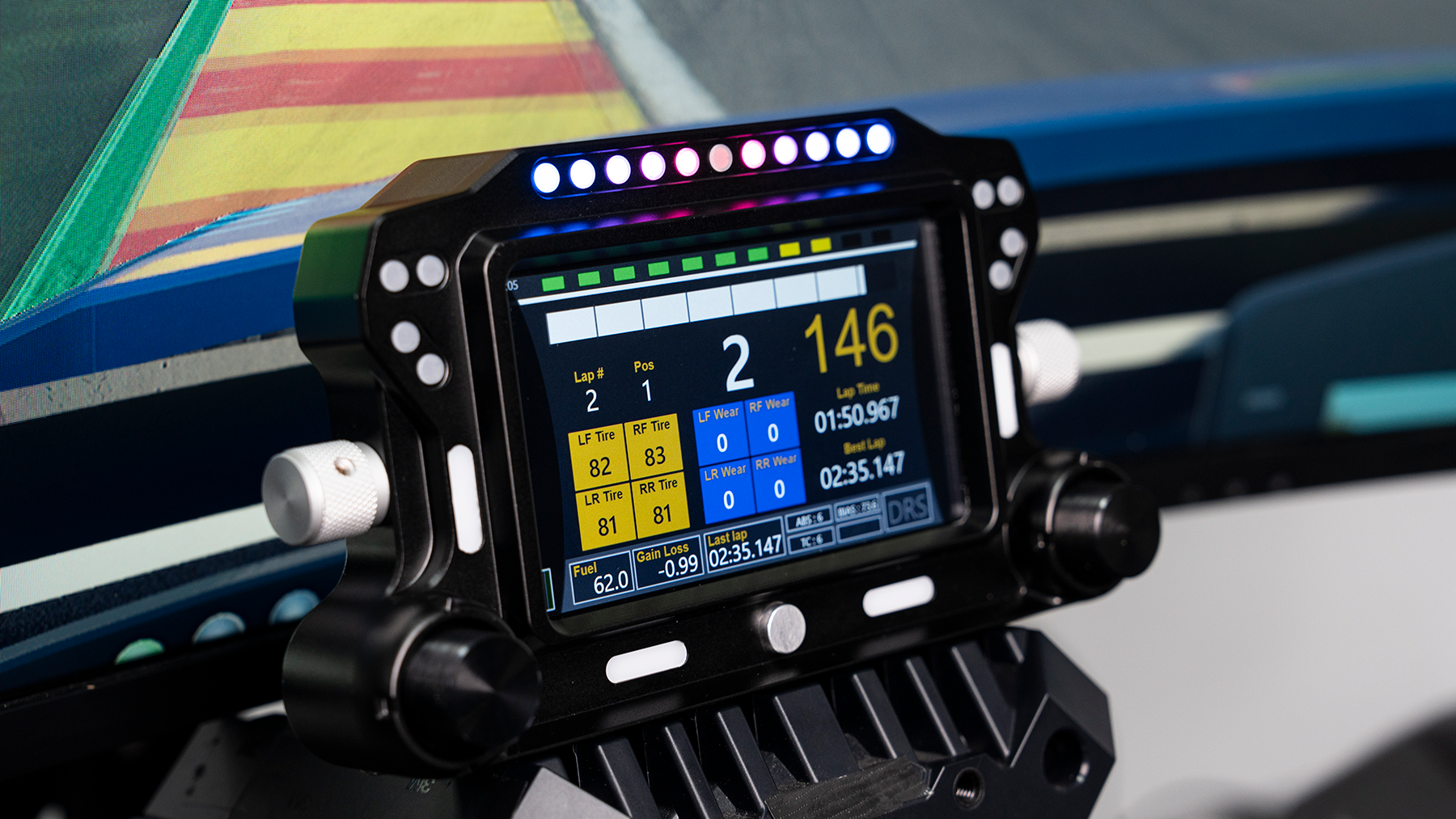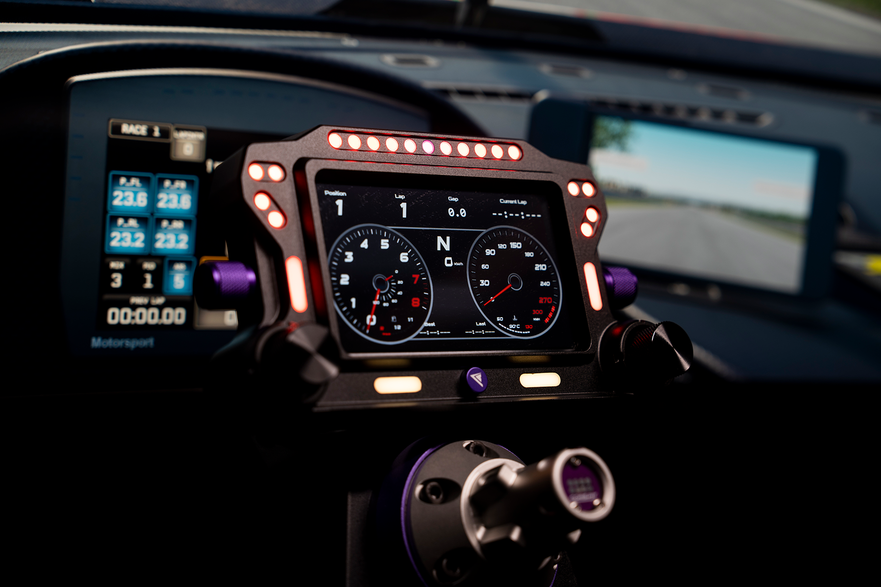 Wszystko, czego potrzebujesz, masz przed sobą — 5-calowy ekran IPS wyświetla w czasie rzeczywistym dane wyścigowe przez SimHub. Cztery pokrętła dają szybki dostęp do funkcji, a zestaw LED‑ów oferuje wskaźniki obrotów silnika, flag i innych stanów w trakcie wyścigu.