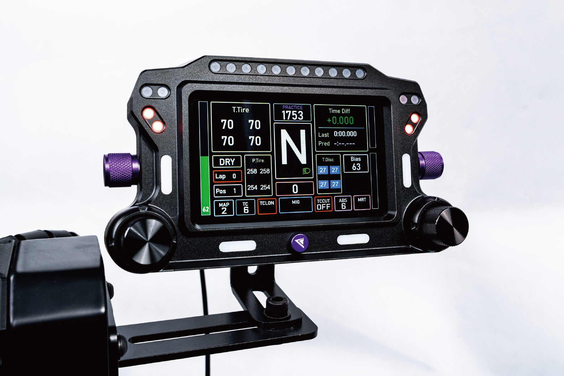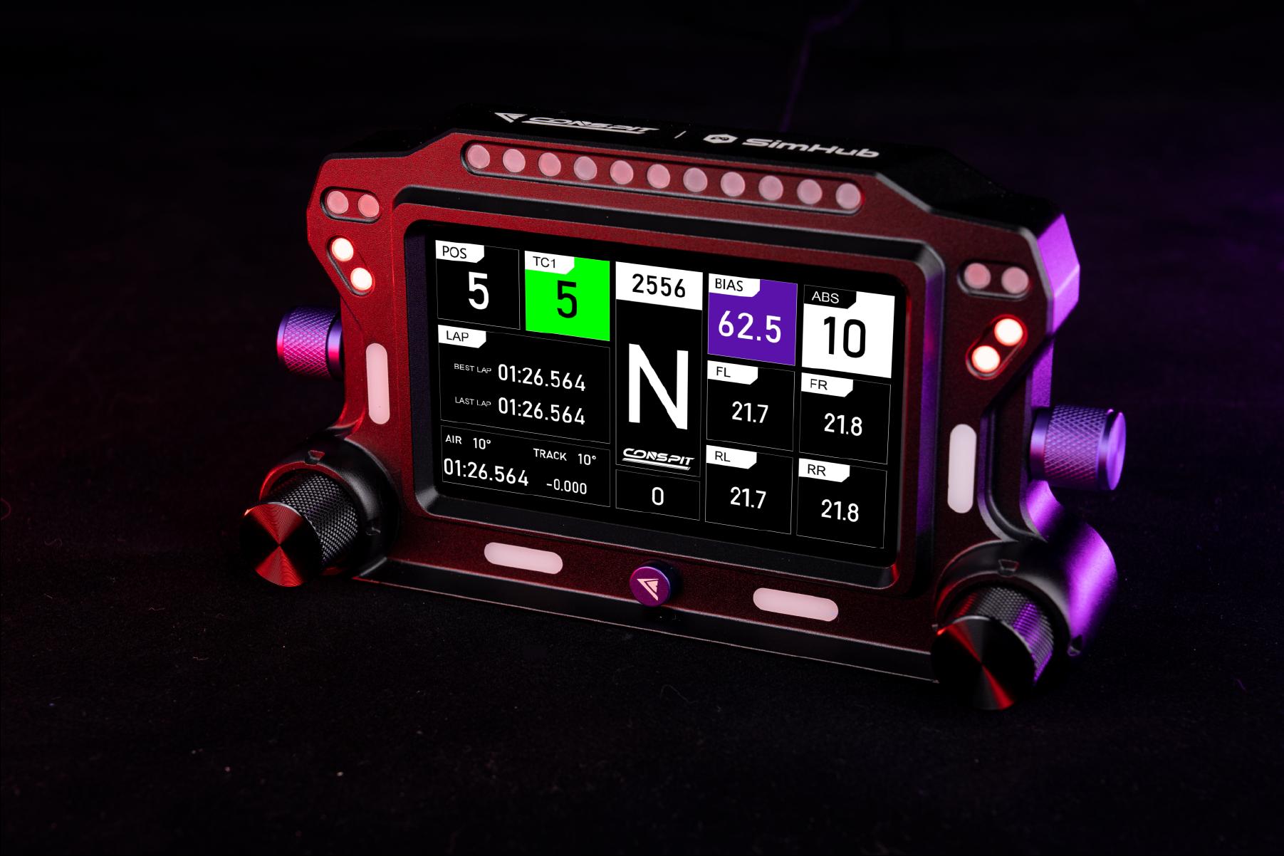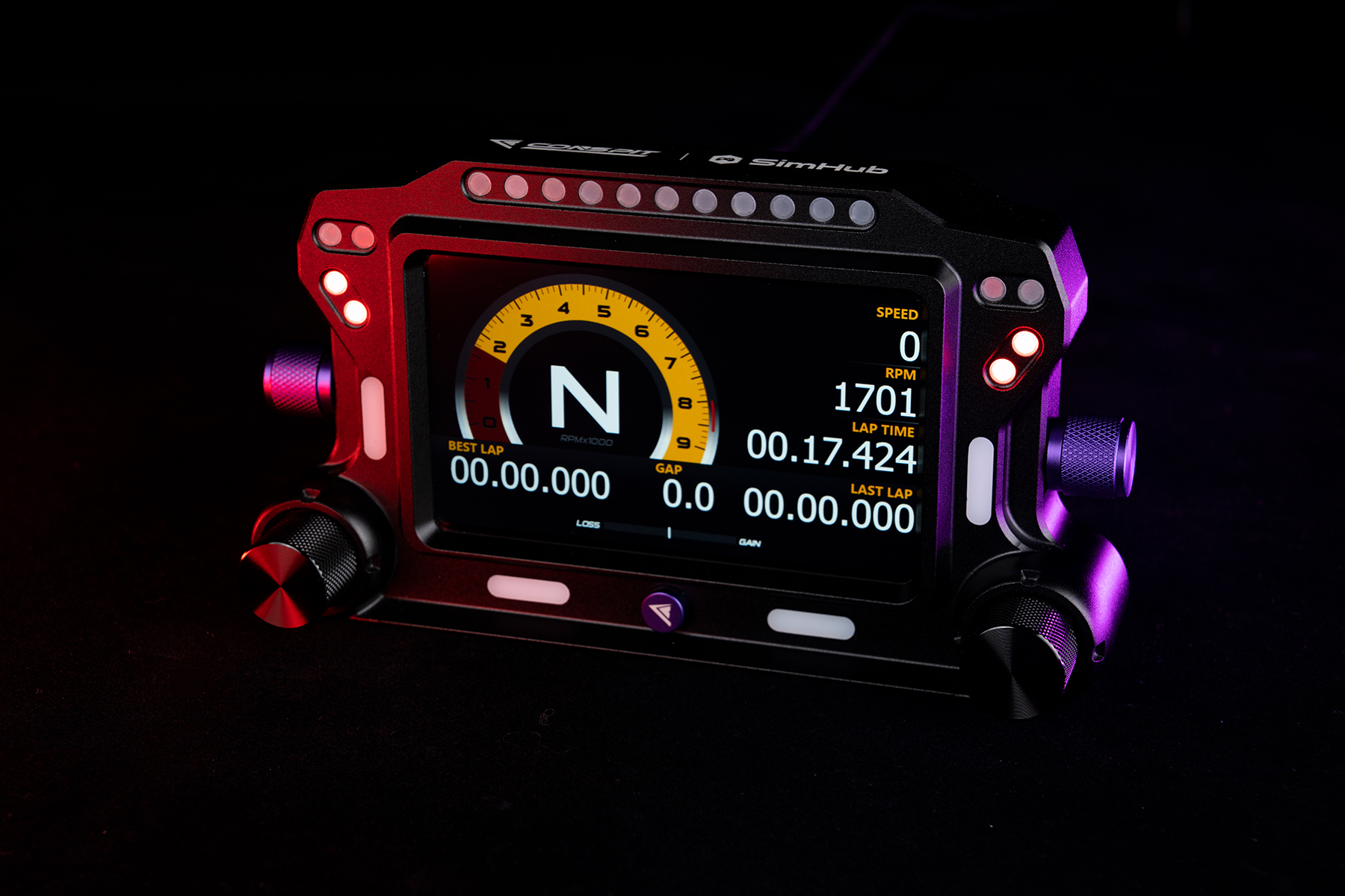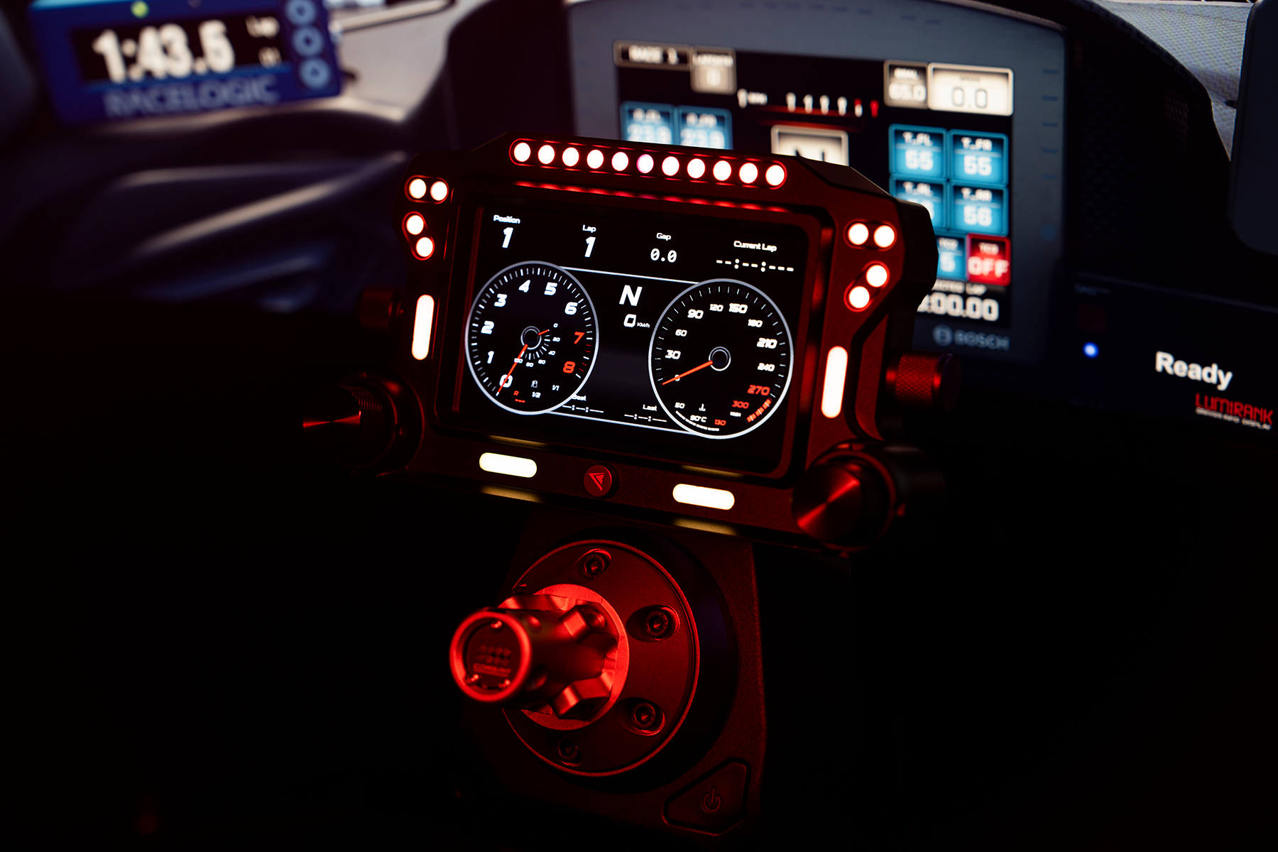 Wszystko, czego potrzebujesz, masz przed sobą — 5-calowy ekran IPS wyświetla w czasie rzeczywistym dane wyścigowe przez SimHub. Cztery pokrętła dają szybki dostęp do funkcji, a zestaw LED‑ów oferuje wskaźniki obrotów silnika, flag i innych stanów w trakcie wyścigu.